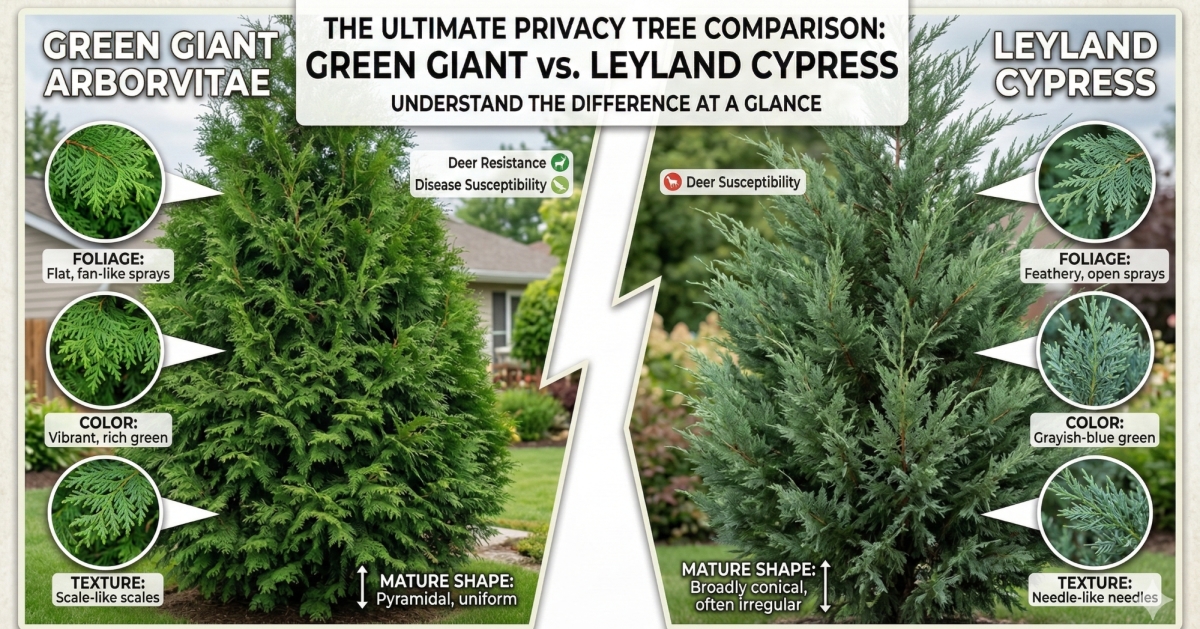 We specialize in arborvitae that bring lasting privacy and beauty to your property. For years, the Green Giant has been our most popular tree — unmatched for growth speed, size, and reliability.